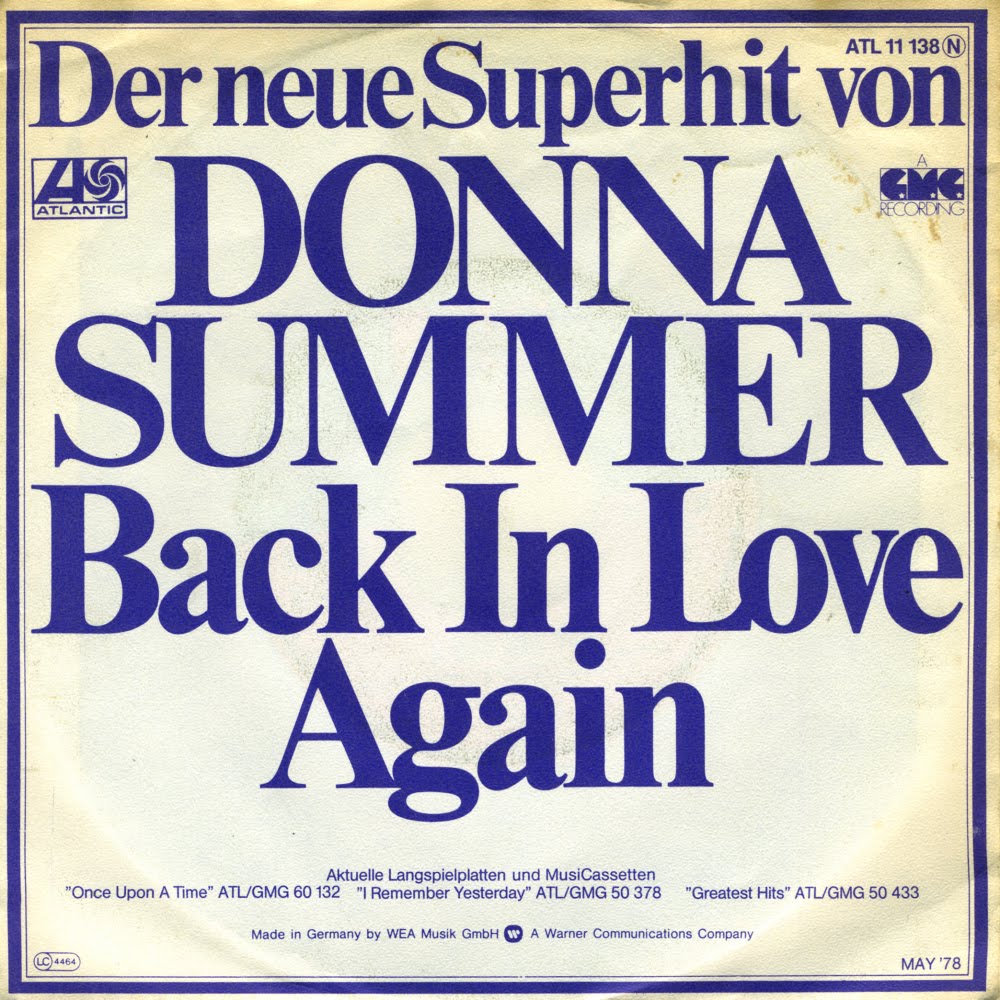 'Back in love again' was released in 1977 as a single from Donna Summer's album 'I remember yesterday'. The track combined a disco beat with an interesting Sixties sound. The song is actually a re-working of a track called 'Something's in the wind', originally a B-side to 'Denver dream', a single released by Donna Summer in 1974.This single peaked at number 29 on the UK singles chart. Although announced as 'Der neue Superhit von Donna Summer' on this German sleeve, the single never made it into the German charts.